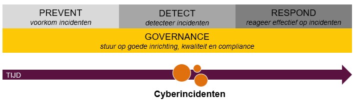 Voor een effectieve cybersecurity-aanpak is het van belang om (potentiële) cyberincidenten centraal te stellen en maatregelen te treffen om deze te voorkomen (prevent), op tijd te detecteren (detect) en er goed op te reageren (respond) zodra ze zich toch voordoen. Ook is het belangrijk om goede governance in te richten. We hebben de diensten die onze leden aanbieden in deze vier categorieën onderverdeeld.